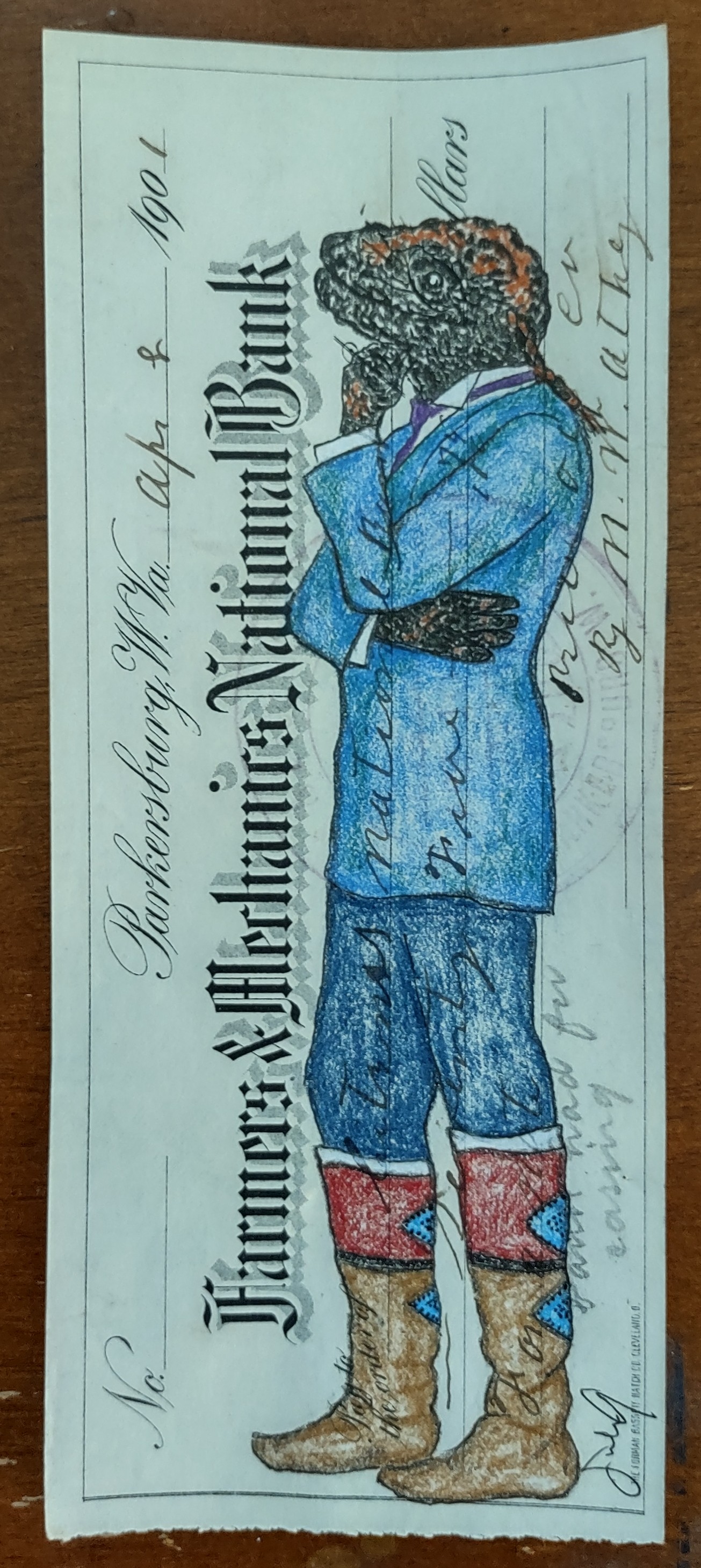 Gil, the gila monster was inspired by Laura Milkins. She made a portrait of me as gila monster when she was a visiting artist here at CSP in Bisbee, so this is the drawing that I made in response! (“Gil, Gila Monster in Deep Thought,” Merchant’s Bank check from 1901, in private collection).
