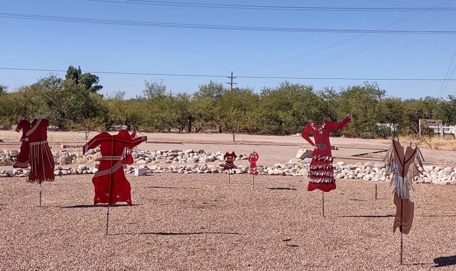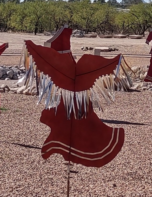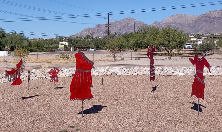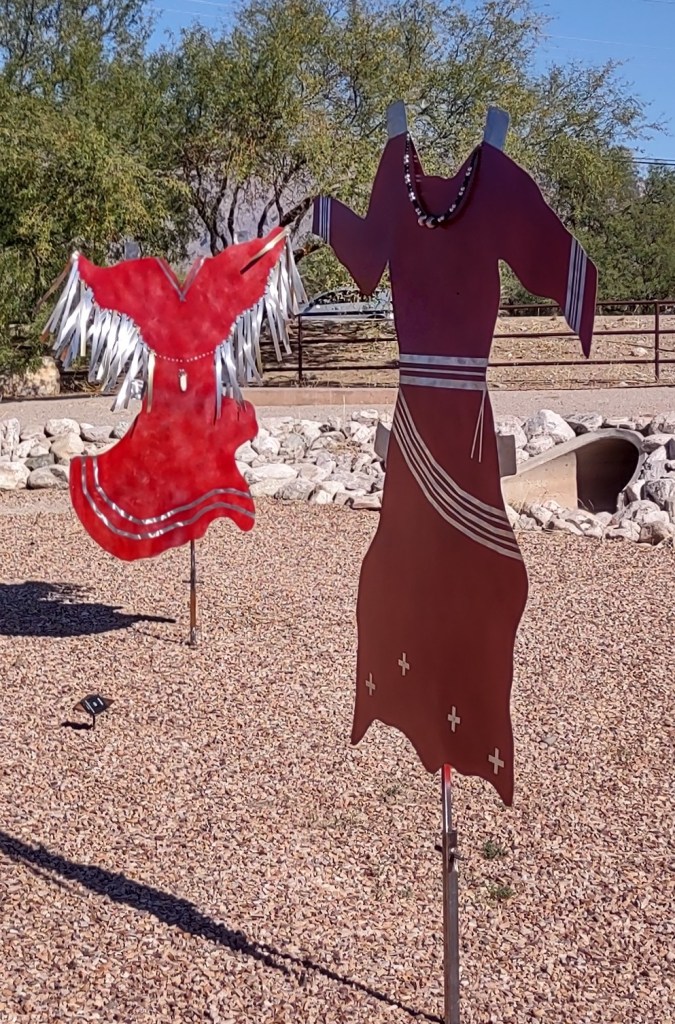 These metal dresses are in honor of the spirits of Missing and Murdered Indigenous Women and Girls.