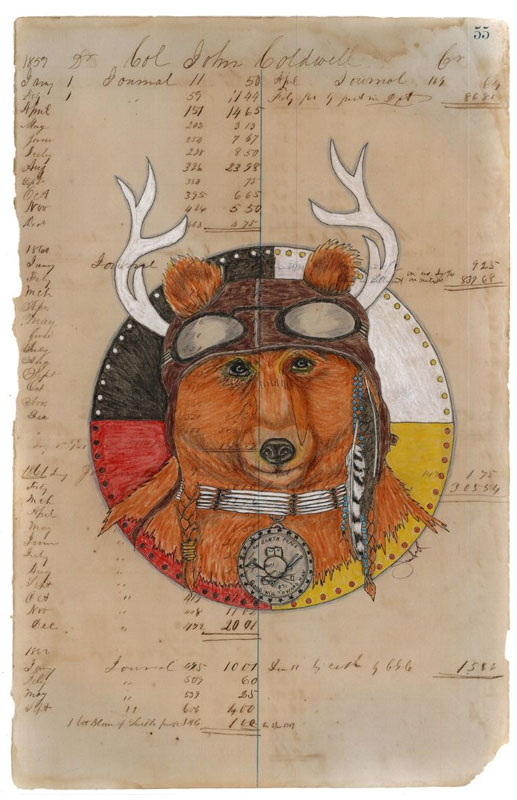 The ledger drawings are not only historically inspired, but portray my love of steampunk, a subgenre of science fiction dealing with 19th-century societies in the midst industrial revolution and its steam-powered technology. I view this era as a particularly tragic one for Native Americans, who were essentially steamrolled by the overwhelming force of “Manifest Destiny.”